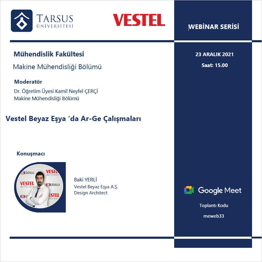 23 Aralık 2021 Perşembe günü saat 15:00'da Dr. Öğr. Üyesi Kamil Neyfel ÇERÇİ moderatörlüğünde Vestel Beyaz Eşya A.Ş.'de görevli Design Architect Baki YERLİ tarafından webinar düzenlenecektir. Tüm öğrencilerimiz ve akademik personelimize duyurulur.