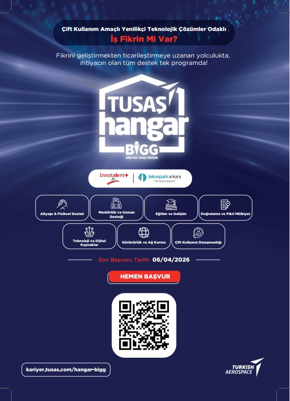 Son başvuru tarihi 06.04.2026 olan HANGAR BİGG programı; Çift Kullanım (Dual Use) Amaçlı Yenilikçi Teknolojik Çözümler odak alanındaki iş fikirlerini değerlendirmeye alacaktır.